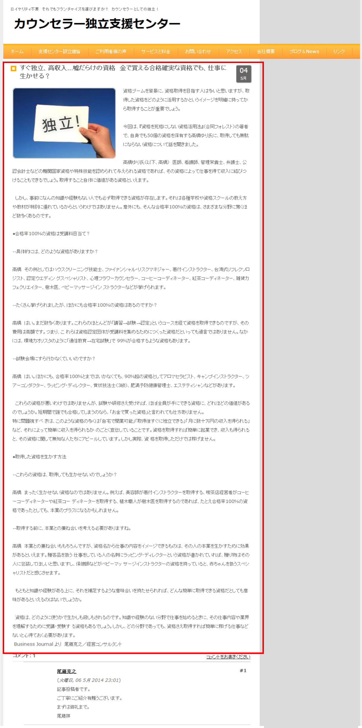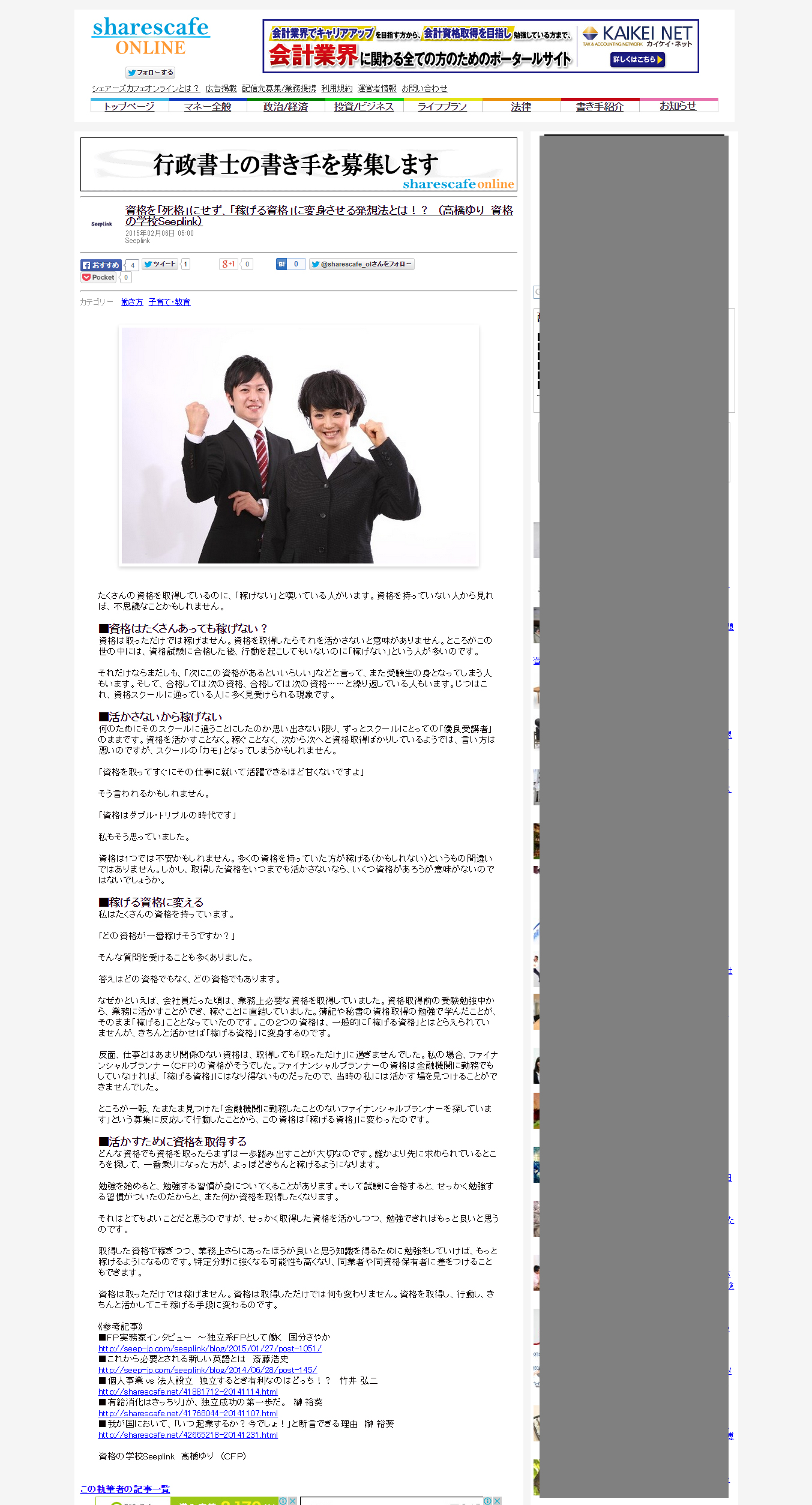 2014/02/06 資格を「死格」にせず、「稼げる資格」に変身させる発想法とは!? (高橋ゆり 資格の学校Seeplink) – シェアーズカフェ・オンライン →詳細はこちら(記事紹介サイトへ) |