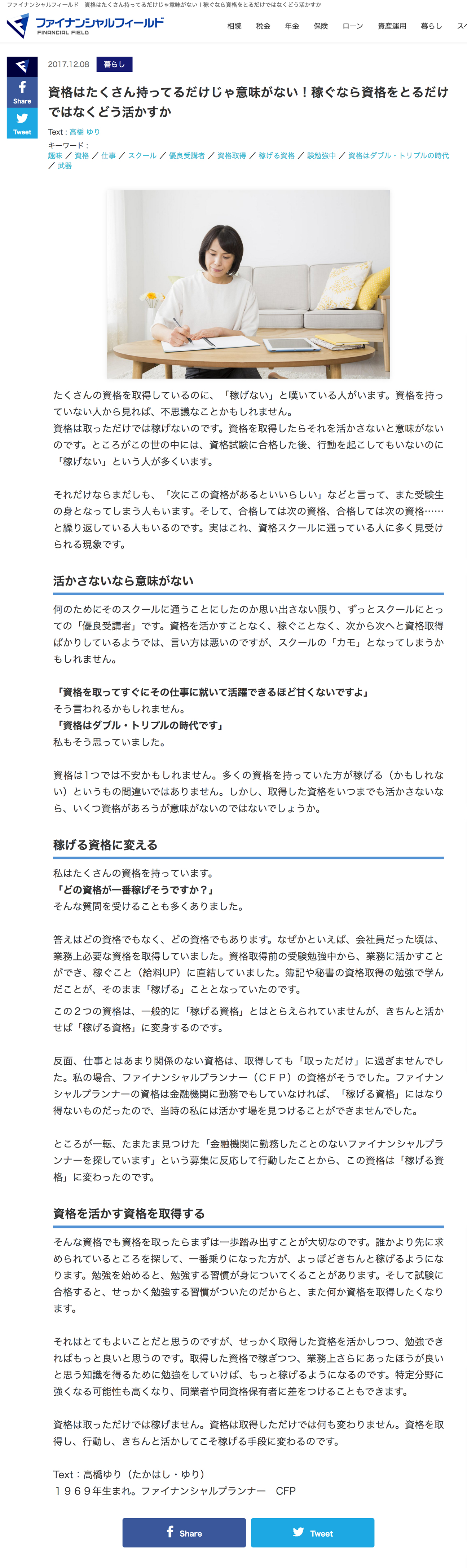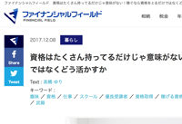2017/12/8 ファイナンシャルフィールドに掲載されました。 「資格はたくさん持ってるだけじゃ意味がない!稼ぐなら資格をとるだけではなくどう活かすか」 |