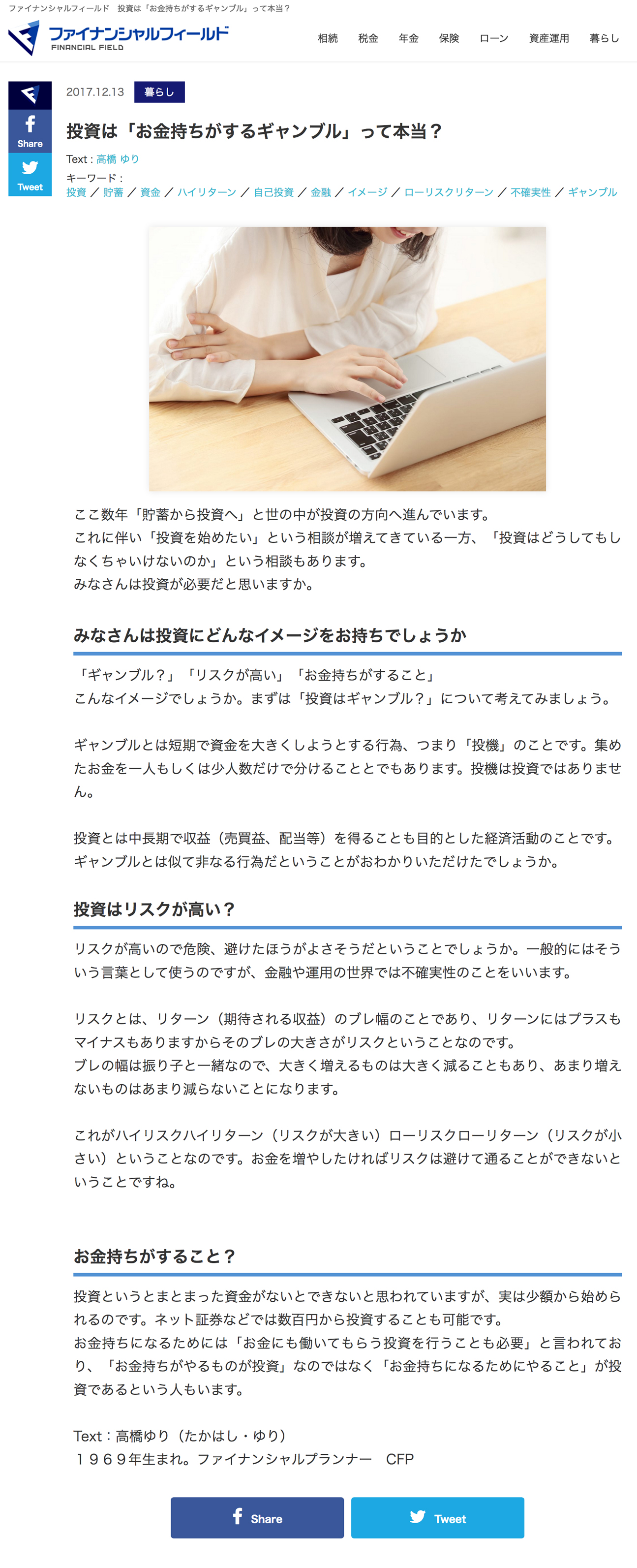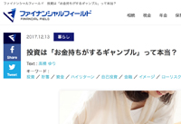 2017/12/13 ファイナンシャルフィールドに掲載されました。 「投資は「お金持ちがするギャンブル」って本当?」 |
