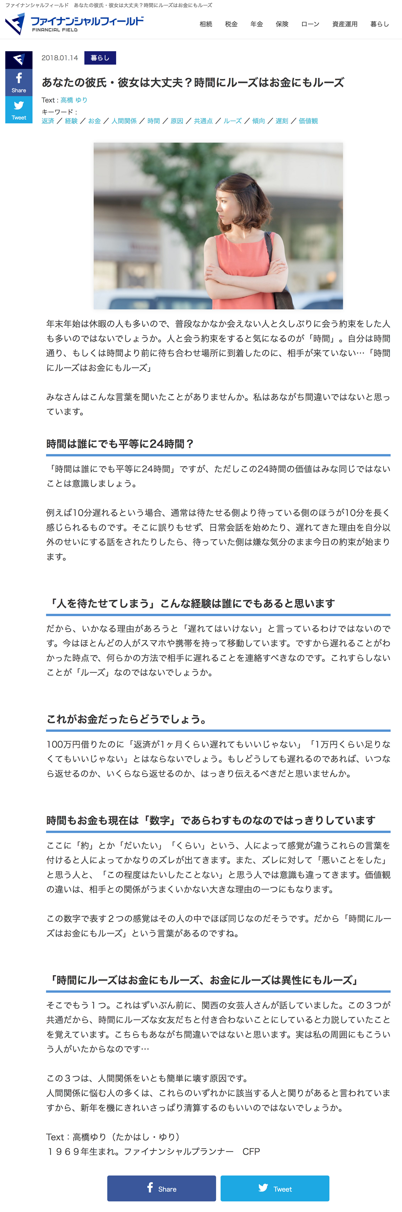 2018/1/14 ファイナンシャルフィールドに掲載されました。 「あなたの彼氏・彼女は大丈夫?時間にルーズはお金にもルーズ」 |